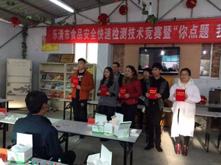 12.4日下午,我公司联合乐清市市场监督管理局在市区乐成街道西城社区文化大院活动中心举行:食品安全快检竞赛暨“你点题,我检测”进社区活动。检测范围包括氢氧化钠、过氧化氢、二氧化硫、甲醛、亚硝酸盐、吊白块、硼砂、农药残留、大米新鲜度等。现场,有14个农贸市场的检测员为市民免费进行食品安全检测。