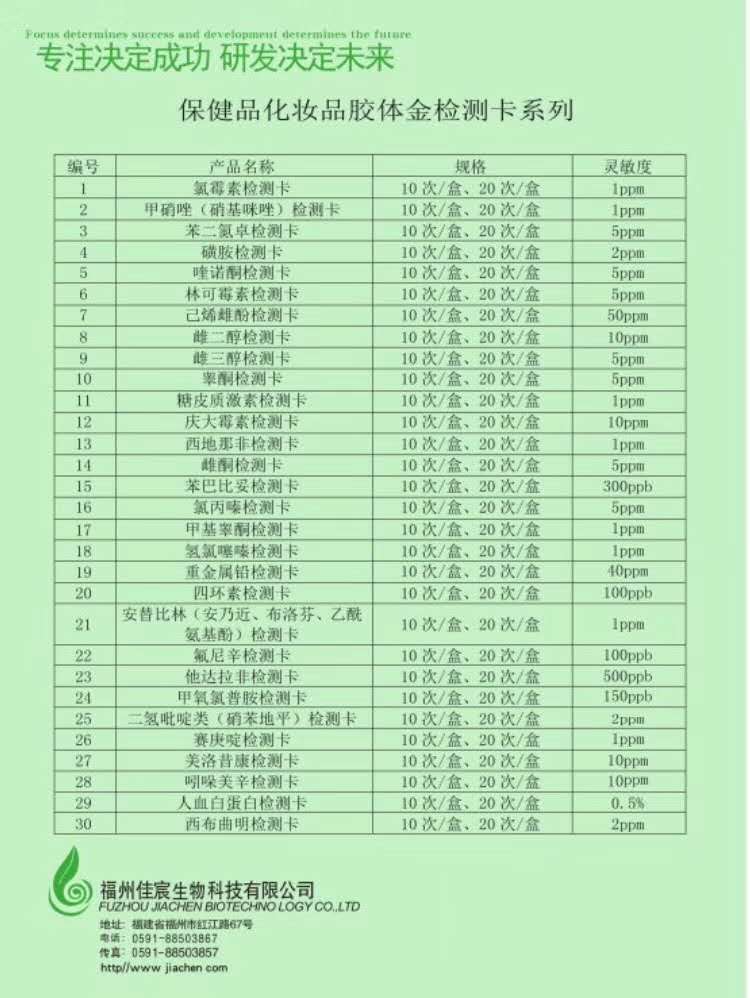 专注决定成功,研发决定未来,公司新增一系列保健食品、化妆品类胶体金检测卡,人无我有,人有我优。佳宸生物产品满足客户的不同需求。欢迎新老客户下单:0591-88503857-8001。