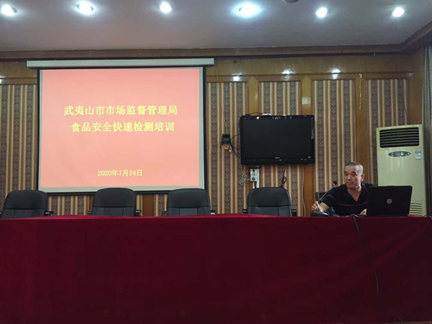 7月24日,为进一步强化市场监管及检验人员对食用农产品快速检测的应用能力,我司受邀武夷山市场监督管理局组织开展了关于食品安全快检技术的培训。培训内容主要围绕快检理论、试剂前处理操作、耗材的使用、仪器操作等,项目以农药残留、甲醛、吊白块、组胺、硝酸盐、二氧化硫、工业碱、双氧水等常规项目为主,培训方式采用“理论讲解+小组提问+实操演练”相结合的模式,确保各市场检测学员能够快速熟练掌握快检试剂及仪器的使用方法,进一步提升学员实际操作能力。