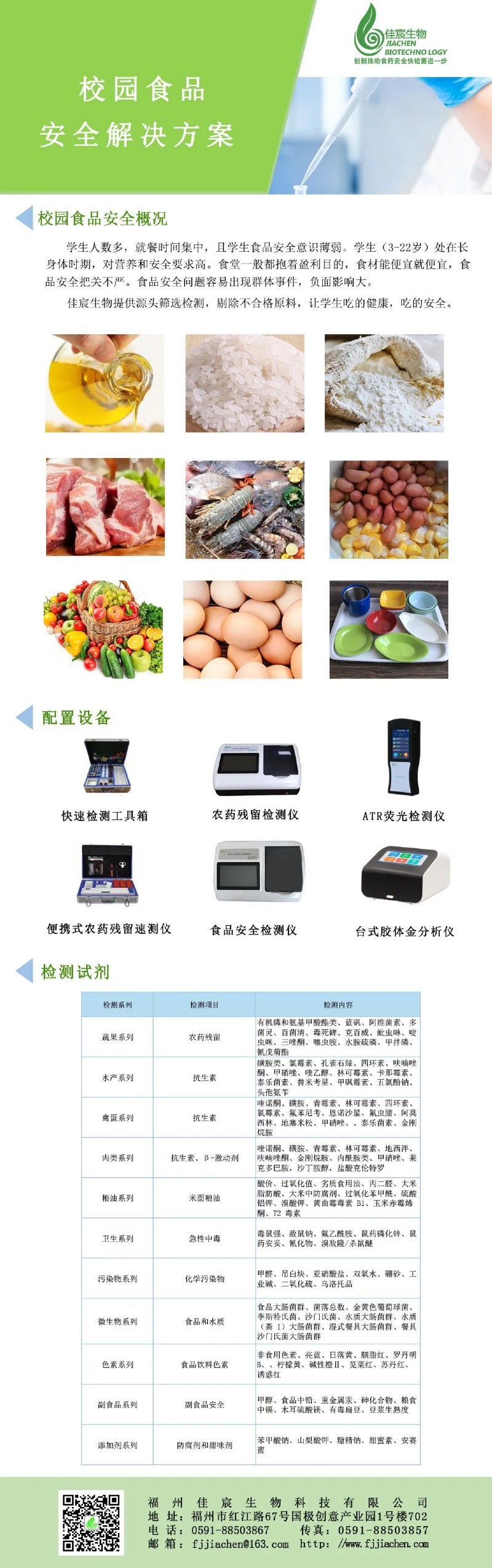 校园食品安全工作一直是食品安全工作的重中之重,是全社会关注的焦点,事关国家和民族的未来。现在有部分高校、中小学校建立了食品安全快速检测室,配备了一些快速检测设备,可以对食品原材料中农药残留、兽药残留、化学污染物,成品菜中微生物等进行快速检测。